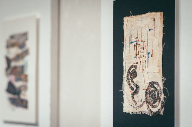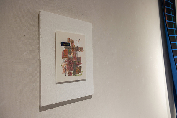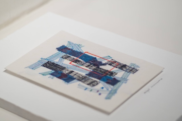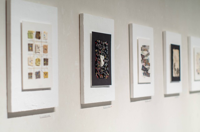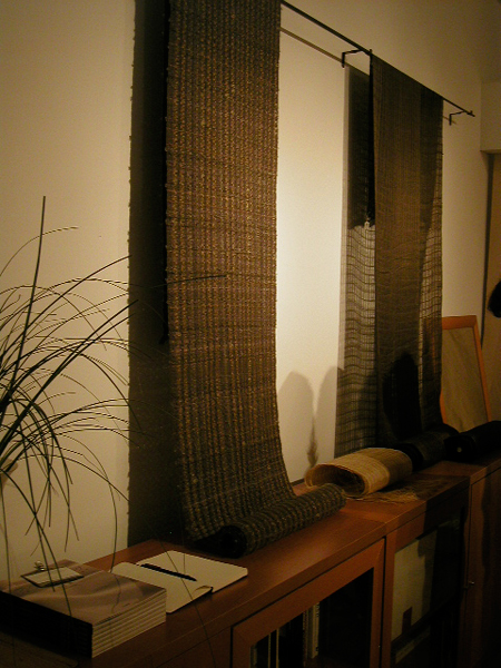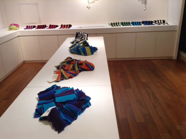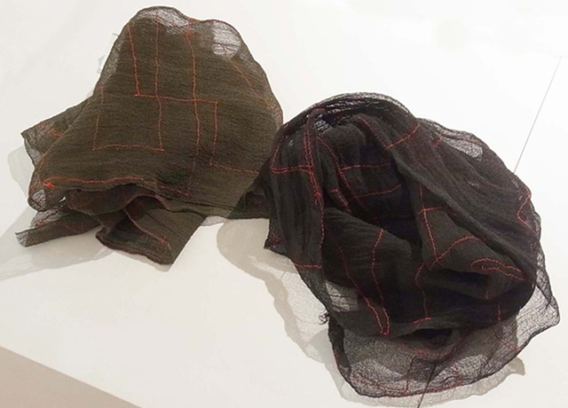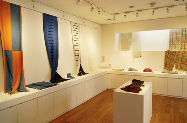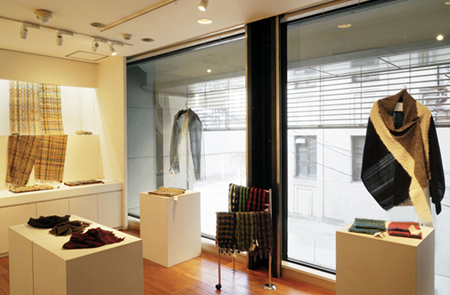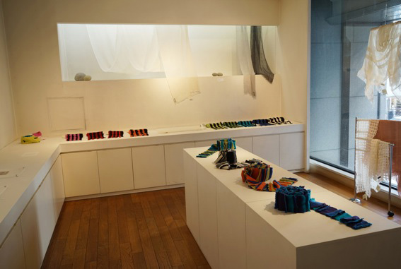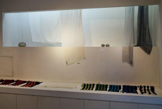 過ぎた日の機微をとどめた、自作のファブリック(裂)と俳句をコラボした「Fabrics & Haiku」のコラージュ作品を中心に。また、カシミヤ・二重織りのストールやオリジナル素材の超極細カシミヤショールなど、色や風合いを、お楽しみください。